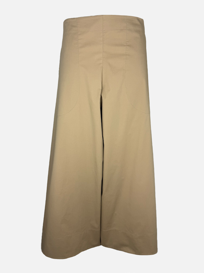 Dieser Hosenrock von GWhite vereint klare Linien mit der natürlichen Eleganz hochwertiger Materialien. Das italienische Label steht für zeitlose Mode mit puristischen Formen, dezenten Farben und einer zurückhaltenden, stilvollen Ästhetik. Gefertigt aus reiner Baumwolle in sommerlich leichter Qualität überzeugt das Modell durch seine fließende, weit geschnittene Silhouette, die optisch wie ein Rock wirkt und zugleich den Komfort einer Hose bietet. Die dreiviertellange Länge und die ruhige Linienführung erinnern an eine Culotte. In der warmen Farbe Safari lässt sich das Modell vielseitig kombinieren und begleitet stilvoll durch warme Tage.