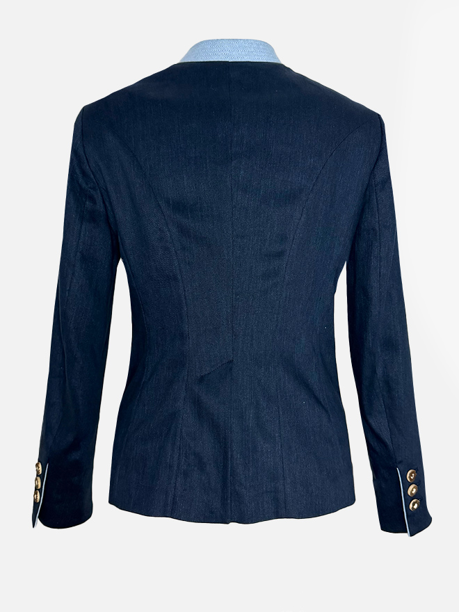 • Farbe: Dunkelblau mit kontrastierenden Paspelierungen