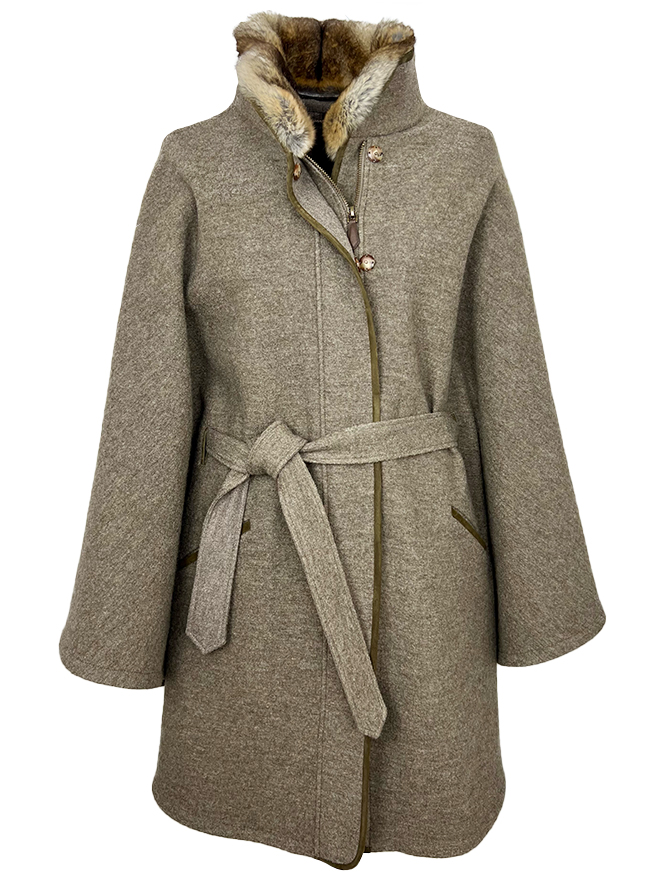 • Details: Abnehmbarer Kragen aus Echtpelz, Eingriffstaschen, paspellierte Gürtelschlitze