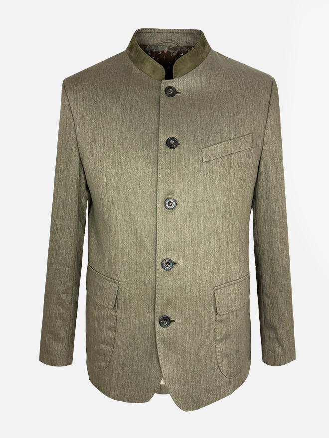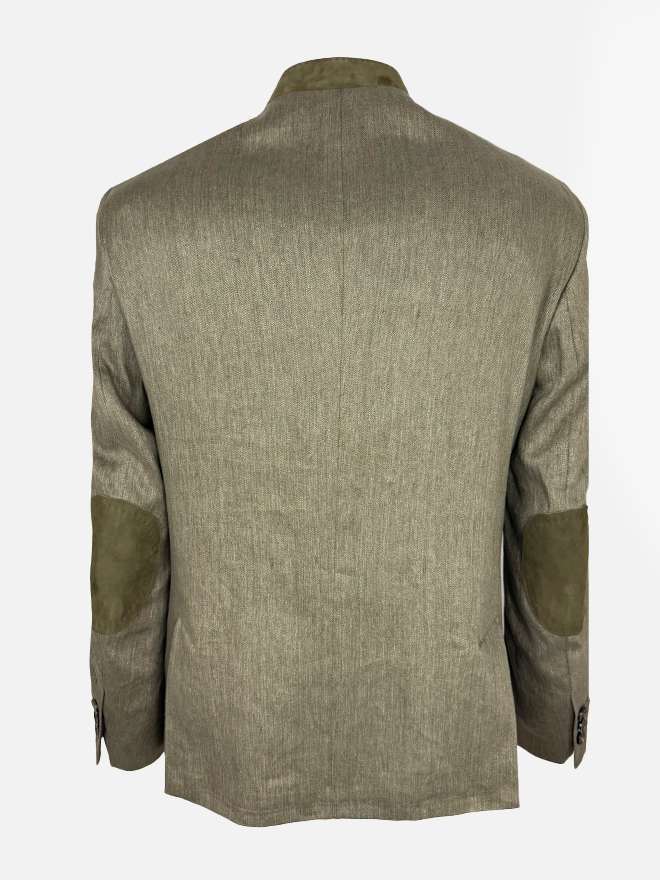 Der klassische Stehkragen, dezente Lederdetails sowie traditionelle Ellbogenbesätze betonen die handwerkliche Herkunft. Die leicht antaillierte Silhouette sorgt für eine klare Linie und macht das Modell zu einem vielseitigen Begleiter für gehobene Freizeit, Reise und sommerliche Anlässe.