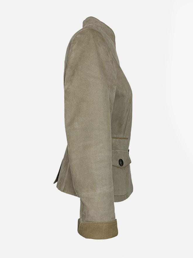 Die Lederjacke Ehrenheim von Habsburg vereint traditionelle Trachteninspiration mit moderner, femininer Eleganterie. Das hochwertige Lammveloursleder in sommerlichem Sandton überzeugt durch seine außergewöhnlich weiche Haptik und eine edle, matte Optik. Feine Leinenpaspelierungen setzen dezente Kontraste, während changierende Logo-Knöpfe und präzise Ziernähte die handwerkliche Qualität unterstreichen.