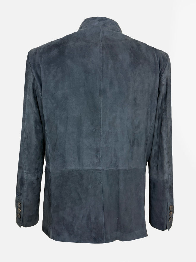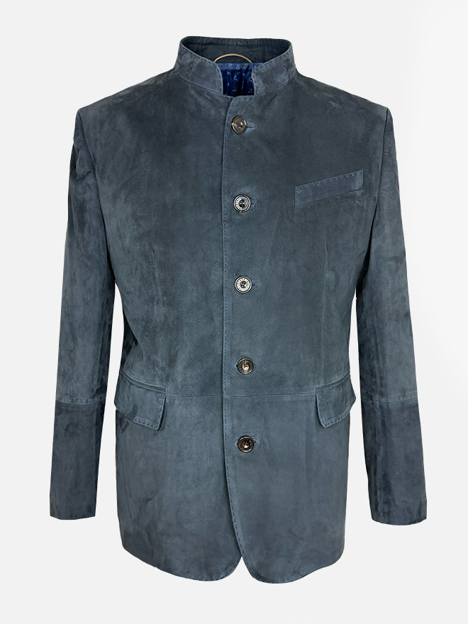 Der markante Stehkragen sowie handgenähte Knopflöcher und edle Büffelhornknöpfe unterstreichen die handwerkliche Qualität. Die leicht antaillierte Silhouette sorgt für eine klare, maskuline Linie, während dezente Leinenbesätze und feine Handstiche die Verarbeitung auf höchstem Niveau zeigen.