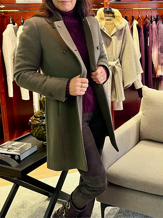 Zeitlose Eleganz trifft feminine Silhouette – der Habsburg Mantel Meiselberg im grünen Fischgrat