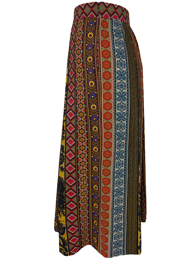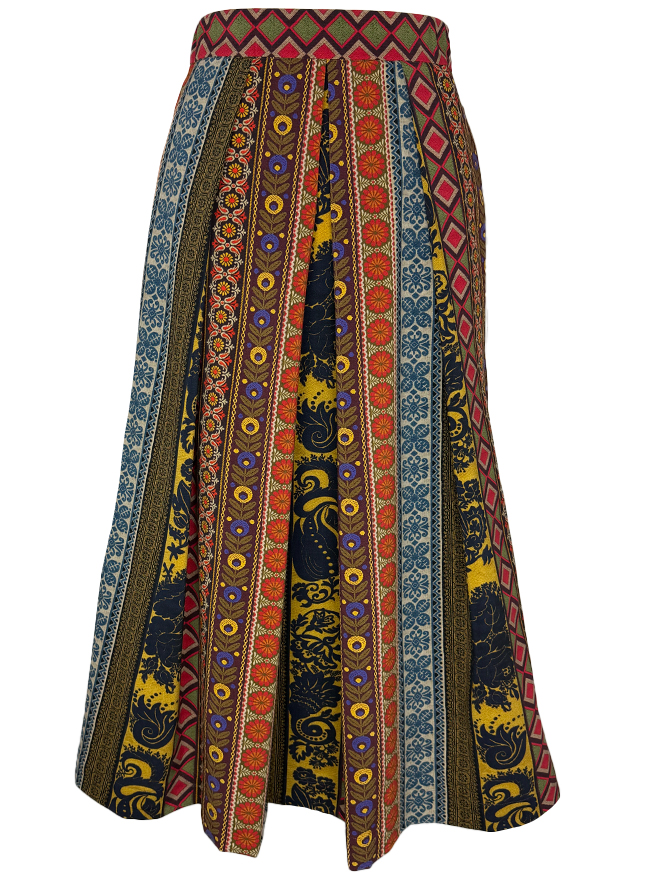 Plisseerock aus feiner Schurwolle mit kunstvollem Patchwork aus folklorischen Mustern,