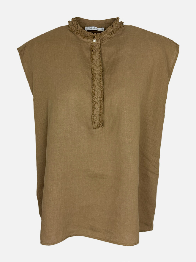 Die tabakfarbene Leinenbluse von Soluzione vereint klare Linien mit entspannter Eleganz. Das deutsche Label steht für zeitlose Damenmode mit italienischer Leichtigkeit – auch dieses Modell überzeugt durch seine luftige Qualität und moderne Schnittführung. Der Stehkragen mit feiner Fransenkante verleiht dem Blusentop eine lässige Note und unterstreicht den sommerlichen Charakter.